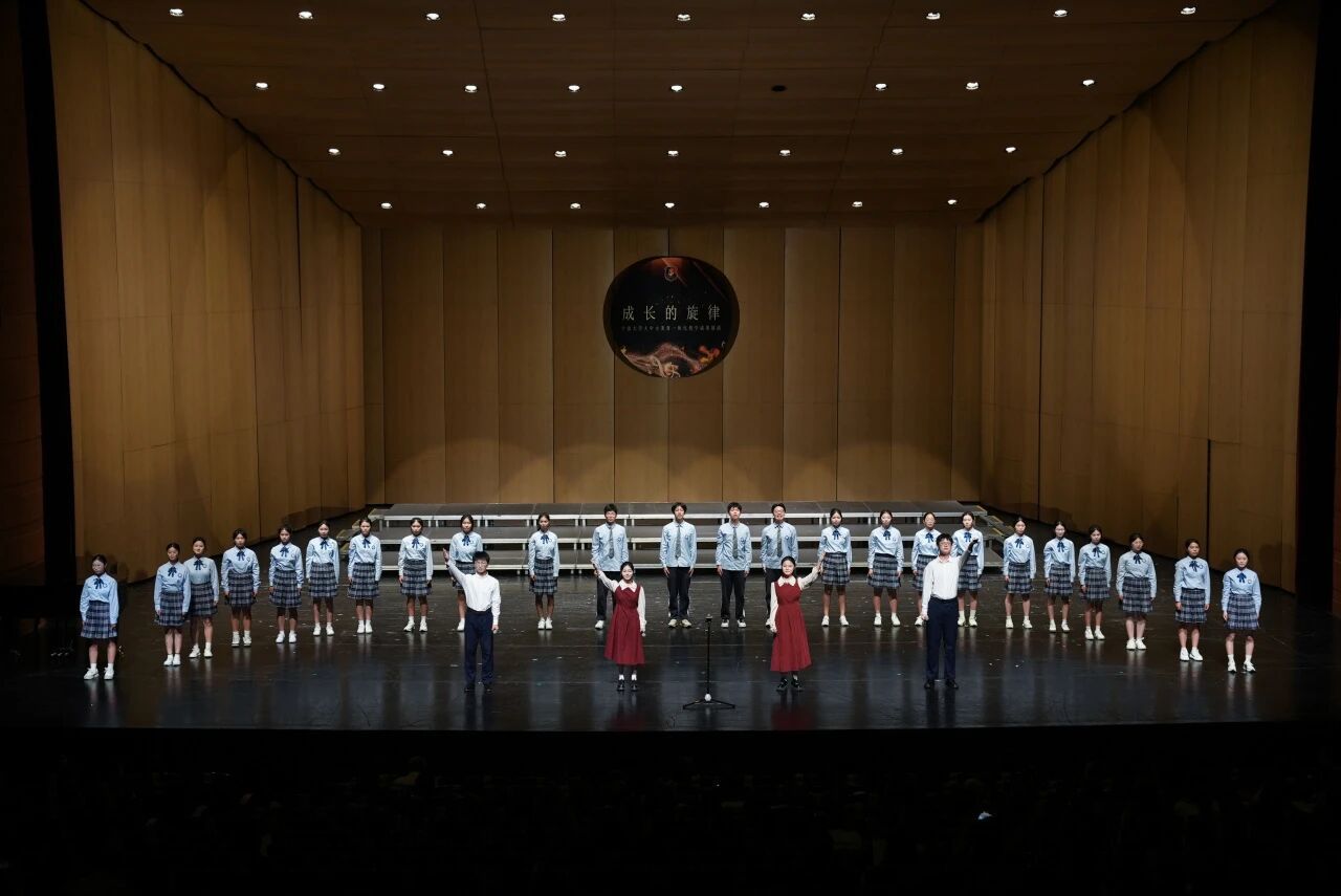 四明中学学子带来的朗诵《百年交响》,凝练中国共产党百年征程的艰辛,以铿锵之声回溯历史长河,传递出新时代青年的文化自觉与使命担当。宁波外国语学校合唱团则以一曲《追寻》唱响新时代学子对理想与信念的坚守。