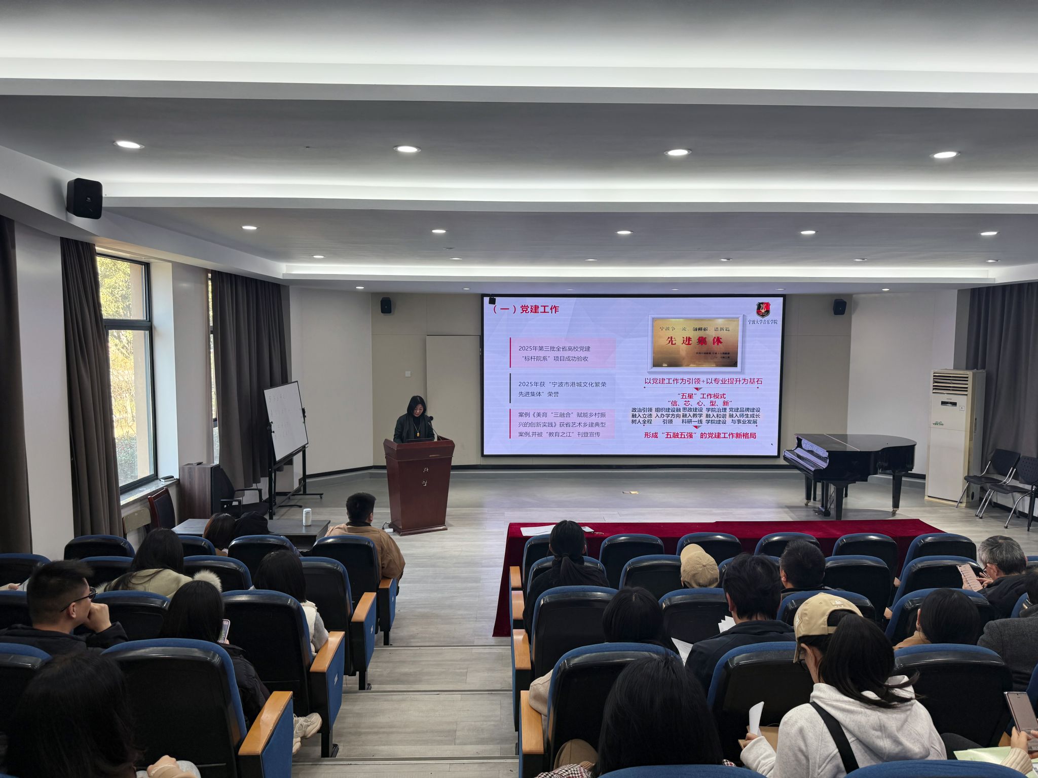 2026年1月14日下午,在学院101阶梯教室举行了西瓜视频 述职大会暨全院教职工大会。院党委书记孔晓虹做了2025年学院工作述职报告,并对学院未来发展规划,学院目标任务,教师工作等方面提出要求。副院长王蕾,刘畅分别就教学、教师教学、科研、研究生工作方面进行了工作总结,并提出新学期工作要求。实验室负责教师就琴房使用等实验室违规行为进行了通报。最后孔书记进行总结,希望全体教职员工在假期,不懈怠不放松,深刻反思,为新学期各项工作做好充分准备!