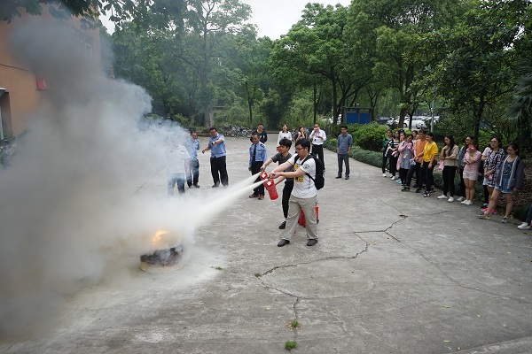 首先,校保卫处徐作义老师、西区保卫处的陈红军老师以及我院师生代表一起观看学习了消防演练的视频,随后徐作义老师做了关于逃生自救消防演练的专题讲座。讲座从如何报警、逃生以及扑救三个大方面系统的讲解了遇到突发事件应该如何处理的方法,增长了我院教师及学生应对突发事件的处理能力。讲座之后,由陈红军老师下达引爆烟雾弹的信号,我院师生从按照徐老师讲授的逃生要点,用毛巾捂住口鼻,弯腰有序的逃往安全地带。逃生演练结束后,校保卫处老师们为师生们讲解如何使用灭火器,并实际操作演练。最后,我院教师和学生代表进行具体的操作演练,在使用灭火器过程中增加了消防意识。