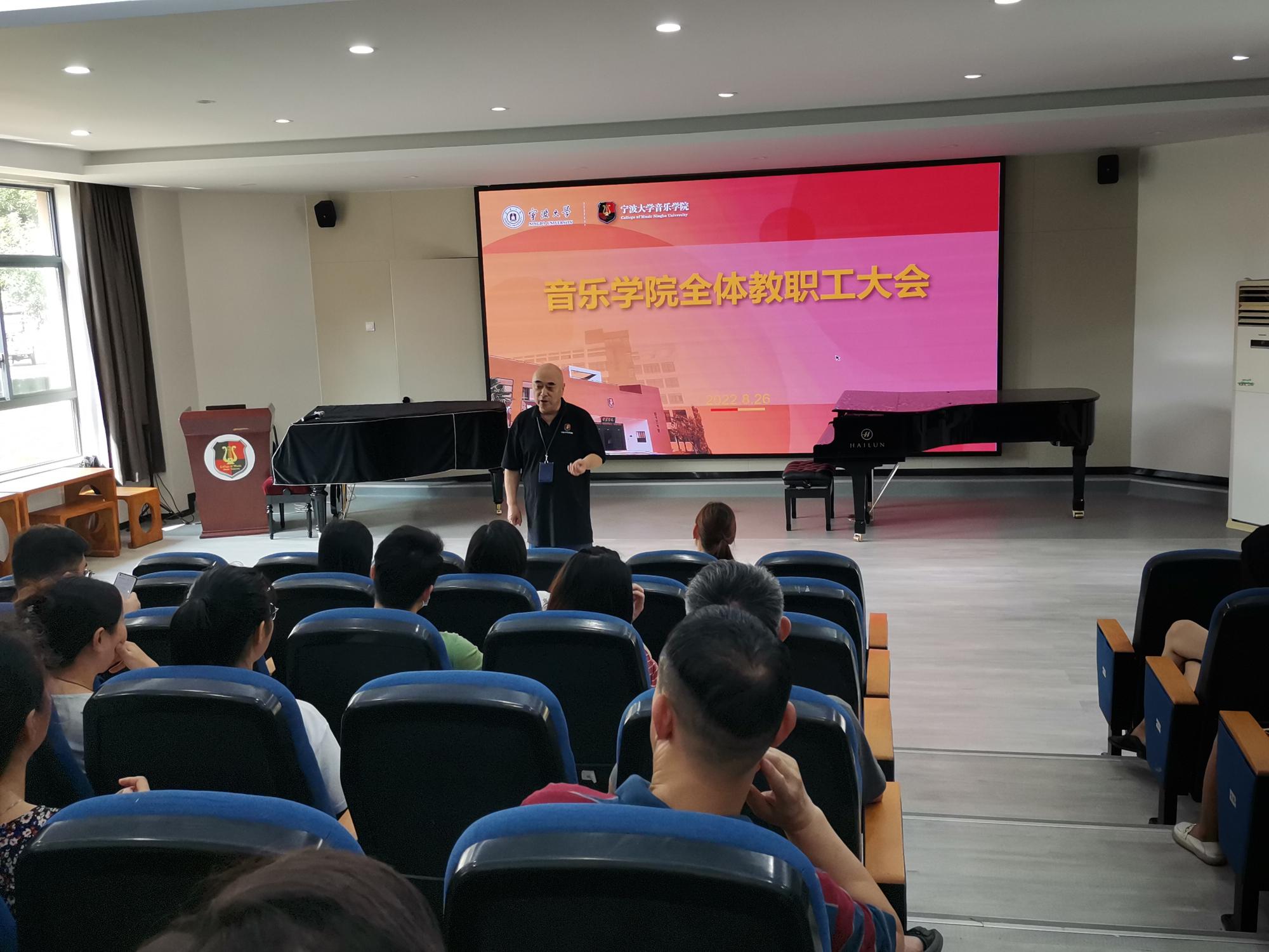 8月26日中午,学院在逸夫艺术楼一楼会议室召开了本学期第一次全院教职工大会。学院党政领导班子、全体教职工参加。会议由学院特聘院长俞子正主持。