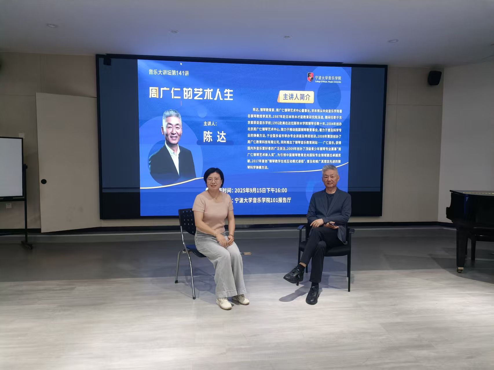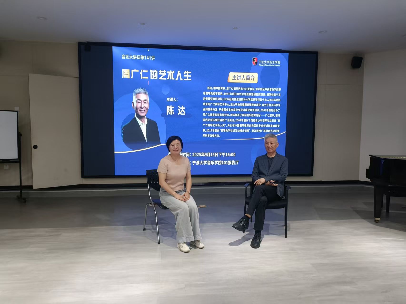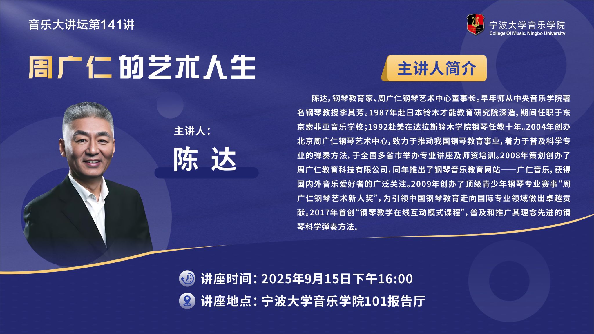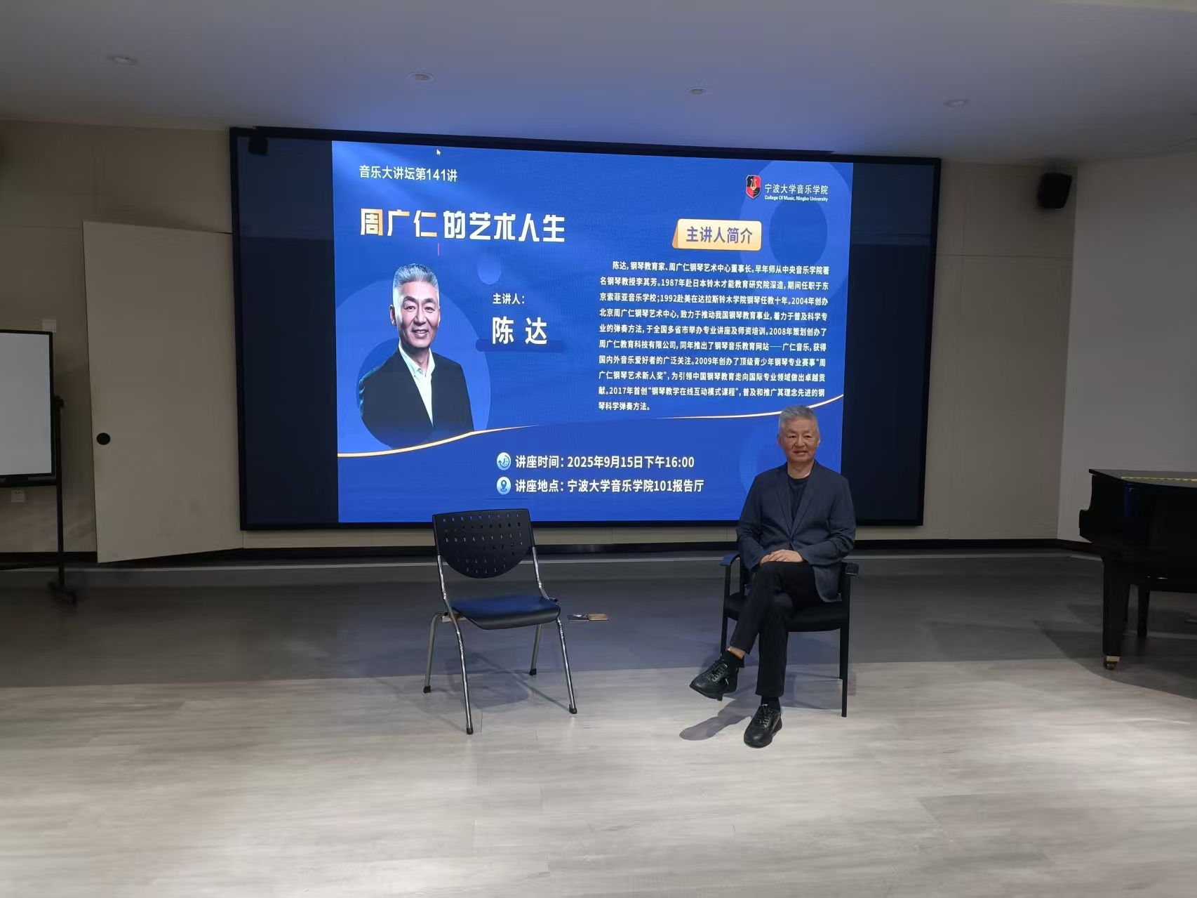 邀请钢琴教育家、周广仁钢琴艺术中心董事长陈达做客音乐大讲坛第141讲,为学院师生做题为《周广仁的艺术人生》的学术讲座。陈达,钢琴教育家、周广仁钢琴艺术中心董事长。早年师从中央西瓜视频