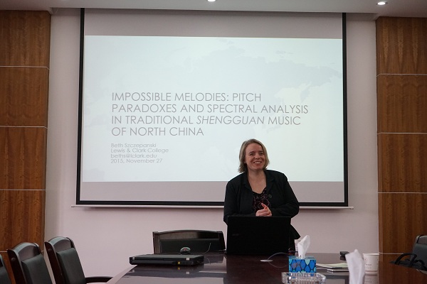 音乐大讲坛, Beth Szczepanski教授为我院师生带来了有关“五台山佛教音乐”的学术讲座。Beth教授曾在五台山居住了10个月,因而得以掌握了大量的第一手资料,对五台山佛教音乐中的笙管乐有着深入的分析和研究。Beth教授通过对其中笙管乐器的声谱和音频的记录和分析研究,发现:管子的基音很强,在一个八度后响度逐渐变弱;而笙的第一个泛音比基音的响度还要大。