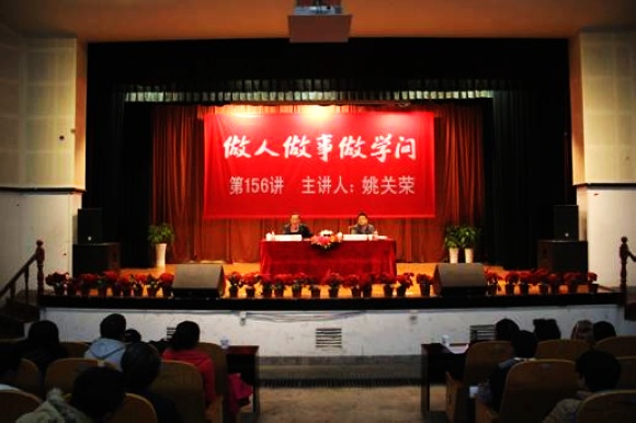 28日晚6时半,讲座在锦绣小剧场如期举行,著名歌唱家胡晓平女士与全校师生近三百人参加了讲座。喻辉院长在主持中这样介绍姚关荣先生“姚先生是第一位率领中国乐团登上柏林爱乐音乐厅、布拉格斯美塔那音乐厅和纽伦堡名歌手音乐厅的中国音乐家,他创造了多项世界级的个人第一”、“在他手里,指挥棒就像永不脱下的‘红舞鞋’,不断地挥舞下去”,同时还援引姚先生的话“电影音乐是我一生的牵挂,我就是为电影音乐而活的”,充分展示出姚先生对指挥艺术的纯真挚爱与不懈追求,穷尽一生探究其真谛。