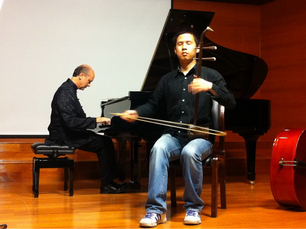 当我们再一次汇聚在小音乐厅,再一次聆听博内特先生的音乐时,彼此间已多了一份亲近和融洽。这是继去年“美国爵士音乐周”后,博内特·汤普森先生再次来我院举办音乐会。精湛的演技、丰富的节目带给广大观众更多的是那一份通过音乐所表达的情感。这是一位视音乐如生命的音乐家,博内特说:“我喜欢音乐相伴的生活”。在博内特先生的每一次音乐会上,我们都能感受到他对中国音乐作品的再创造。在本次音乐会上,他同我院演奏二胡的学生合作演出了《除夕小唱》和《江河水》等曲目,他凭着自己对中国音乐的理解和作品风格特征的把握,进行了再创作,新颖的和声融合了中西方的音乐语汇,丰富了音乐的层次,给音乐注入了新的活力。