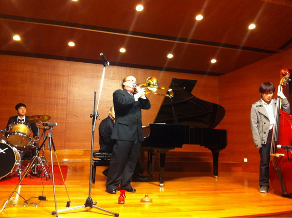 教授学生。他的课由于他的个人魅力以及充分的备课展现出一幅幅精彩的动人画面,每节课前,博内特先生都会进行充分的备课准备,并将资源共享在他的个人网站上,以保证每个学生可以清楚了解到上课的进程。为此,他经常工作一整晚,熬夜为学生做课件编写课程安排。这次他在宁大进行为期四天的讲学和演出活动,他辛勤地忙碌着他的音乐,他总是早上给学生上课,下午排练他的音乐会节目,时间排得满满的。短短四天内,他同歌手、二胡、长号、贝司等完成了整场音乐会的排练。学生们发自内心的说:“他真的是一位严谨认真负责博学的好老师,我们欢迎这位伟大的老师,喜欢他给我们带来更多更好的爵士乐知识”。(钟青)