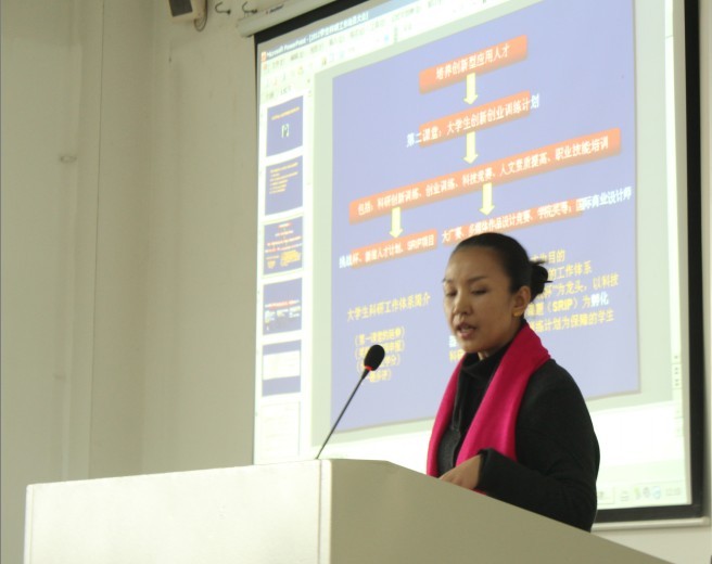 学院艺术设计系许雯老师在会上作了动员,她分析了科研对学生成长成才的意义,并传达了学校于2011年推出的一系列科研激励政策,希望全体学生都能积极投入到学生科研工作中来,促进自身各方面能力的发展,介绍了学生创新创业体系以及与学院相关的创新创业训练项目,并通报了近期学生科研工作安排。校团委周星宇老师给大家作了如何开展“挑战杯”全国大学生课外学术科技作品竞赛课题申报和课题研究的指导,他强调要遵循15字选题原则即“针对大背景,着眼小领域,解决真问题”,并针对哲学社会科学类课题的申报,有的放矢地提出了宝贵的建议和意见。