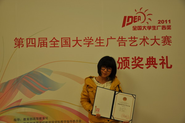 11月19日下午,第四届全国大学生广告艺术大赛颁奖典礼在北京人民大会堂隆重举行,全国等级奖获得者一一上台领奖。由我院艺术设计系周艳老师指导、郑露、邓美玲、吴家晔等同学创作的《外婆家的枣树》通过层层选拔,最终喜获三等奖。