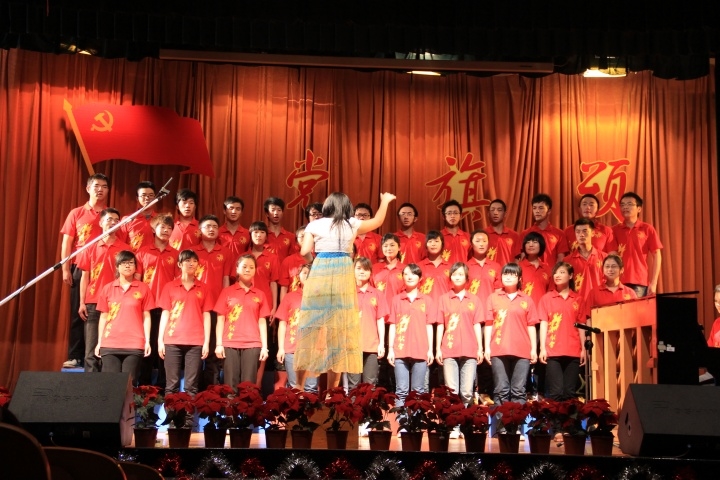 优美的傣族舞《竹林深处》拉开了晚会的序幕,王科荣同学的一曲《军营里飞来一只百灵》,甜美而激情,掀起了晚会的第一个高潮。晚会节目类型丰富多样,钢琴伴唱《松花江上》、红歌串烧《那一抹红色》、歌伴舞《一杯美酒》、外国友人keaia和毛亚杰合作的小提琴钢琴合奏《one summer s day》,同学们以优美的舞姿、深情的演唱、精湛的弹奏为在场观众献上了一场震撼的视觉盛宴。值得一提的是,在琵琶古筝二重奏《春江花月夜》美妙乐声的衬托下,我院蓝陈军、李健两位同学合作,在短短5分钟的时间内,现场作画《大鹏展翅》、书法《风华正茂》,向党的生日献礼,赢得了观众们的阵阵掌声。最后,校红歌会也带来了大合唱《鼓浪屿之波》,为晚会画上了一个完满的句号。