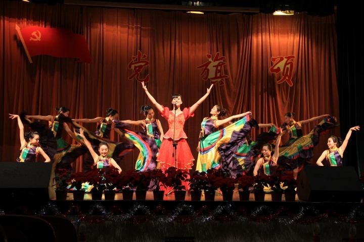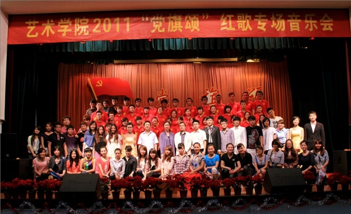 首届周末锦绣文化航班第六站——“党旗颂”红歌专场音乐会。本次音乐会以“丹青描绘坚忍志、青春高歌红色魂”为主题,向建党九十周年献上了艺院人的一份珍贵礼物。院长喻辉、院党委书记袁虹、副书记叶春桥等学院领导和校团委毛璇老师、各学院分团委书记、学生会主席以及近300名师生观看了晚会。