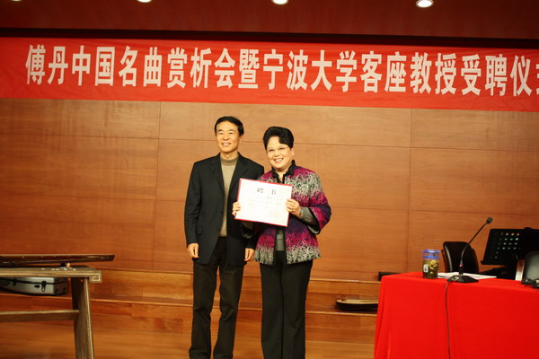 赏析会上,傅丹女士将在场师生带入到一个唯美动听的音乐世界中,令广大听众如痴如醉。她与大家一起赏析并演奏了《十面埋伏》、《霸王卸甲》、《江南春》、《平沙落雁》等琵琶经典名曲。三弦、柳琴演奏家姜水林、琵琶演奏家王涛、笛箫演奏家陈杭明等艺术家共同参与了表演。宁波市文联副主席、宁波市美术馆馆长韩利诚出席了本次活动。