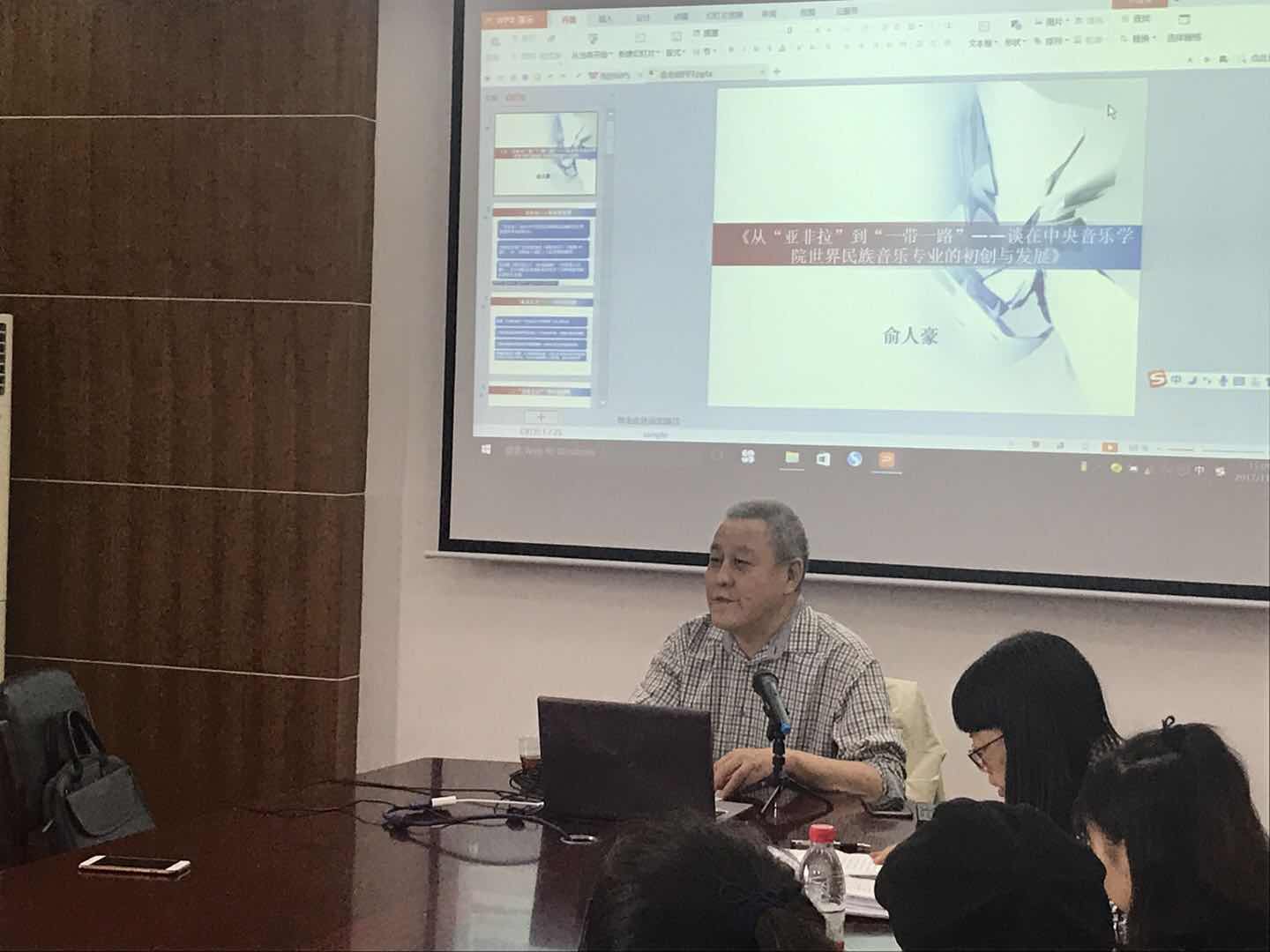 为例,阐述世界民族音乐专业的初创与发展。内容分为四个时期:第一,亚非拉---学科孕育期;第二,“拿来主义”---学科初创期;第三,引进来与走出去---学科发展期;第四,面向全世界---双向平等交流期。在整个讲座过程中,俞人豪教授以自身的人生体会为例,对逐个时期展开讲解,内容生动丰富,引人深思。在讲座结尾处,俞人豪教授提出:作为中国人研究世界民族音乐应该有自己的立场和视角,应该在音乐国际论坛上阐述自己的观点,在舞台上发出自己的声音,正如习近平总书记在“一带一路”国际合作高峰论坛开幕式上所描绘的美好愿景那样:我们将建设丝绸之路沿线民间组织合作网络,打造新闻合作联盟,音乐教育联盟以及其他人文合作新平台。”(顾君嘉)