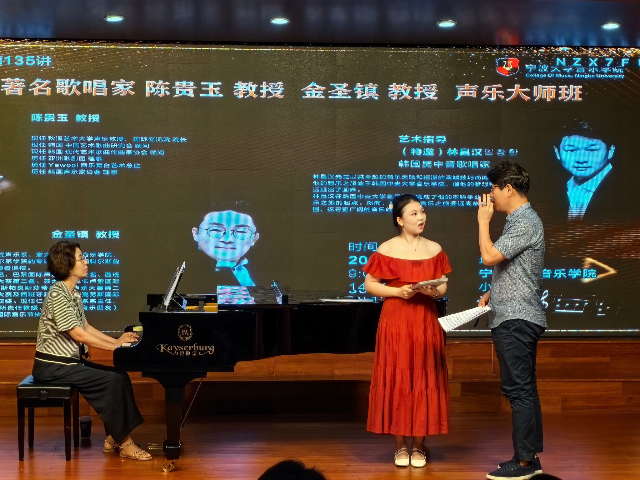 的学生带来了《女人心》、《赛船会前的安佐雷塔》等歌剧的经典唱段。林昌汉老师提出了在演唱声乐作品时候三个最重要的要素:音准、气息及咬字,并依次对这三点进行讲解教学。其中,音准是第一要素,也是声音演唱的基础。而对于呼吸及咬字问题,林昌汉老师表示,在演唱时应先有呼吸,后有咬字,在咬字发音前首先需要有完整的气息支撑,保持气息向上,在确保气息稳定后再咬字,五音也需要保持在一个位置发声。金圣镇教授则主要对作品的音乐风格、创作时期等要素进行讲解。如在演唱巴洛克时期的歌曲时应注意音色及颤音处理等,此外也应根据个人特点来增加演唱细节。