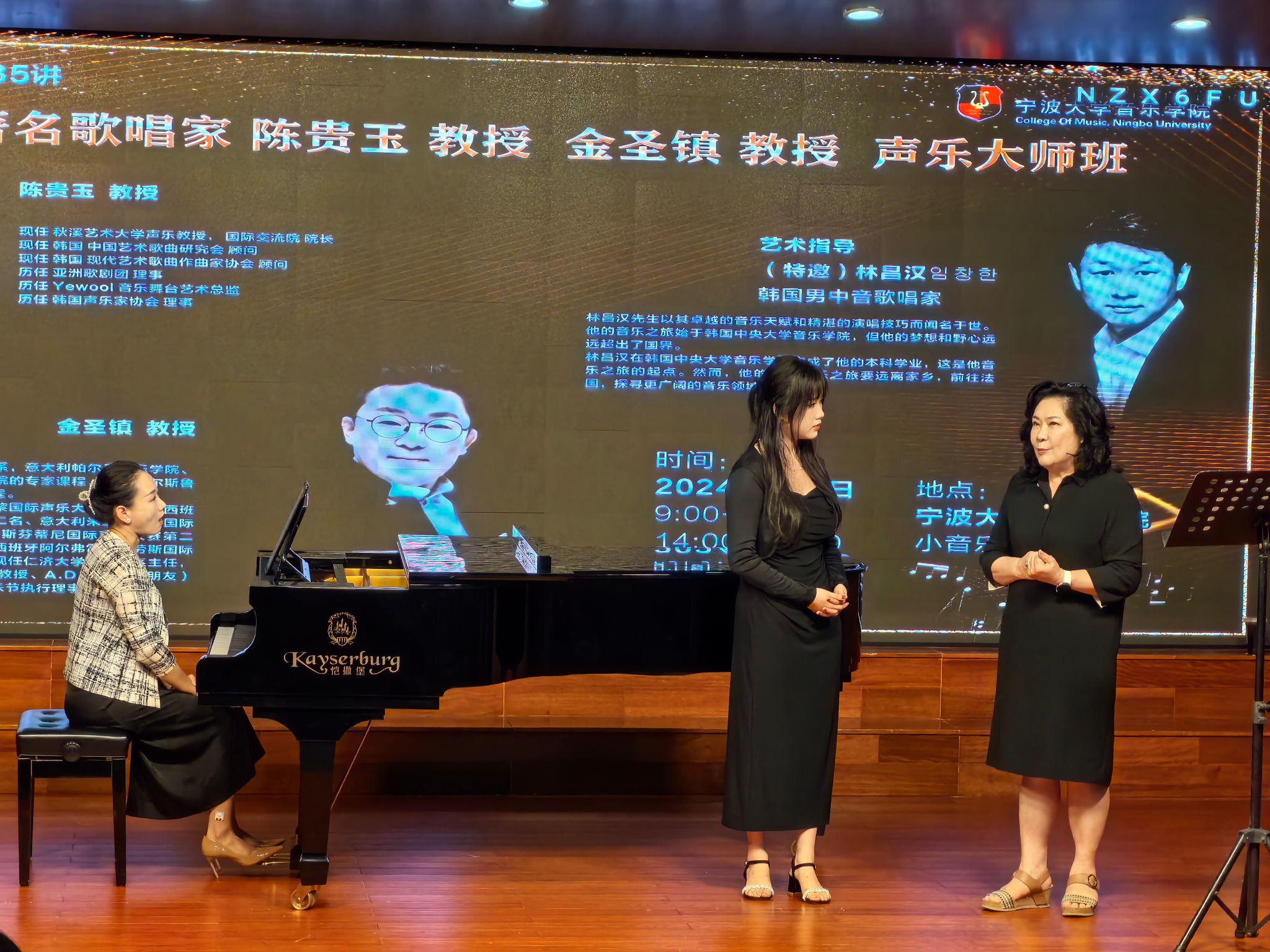研究生院的同学分别带来了《人们都叫我咪咪》及《杨柳》两首来自意大利歌剧的经典唱段。陈贵玉教授就人物性格、表情处理、情感变化等方面进行了细致讲解。包括对人物性格的把握、角色心理变化、心理在面部的表现、情感在声音上的表现等。陈贵玉教授尤其强调了在演唱时情感的自由变动,即演唱时的Rubato,在抒发角色情绪时应加入自由的声音调控。此外,陈贵玉教授也对两位同学演唱意大利歌曲时的发音做了细致的调整,包括意大利语音节、气息及咬字的协同等。
