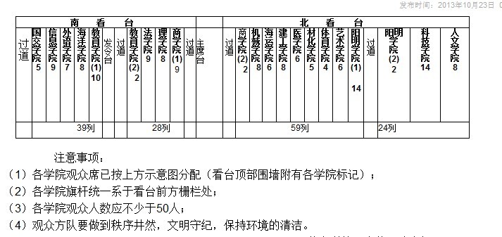 请各位同学在班长、团支书的带领下提早10分钟到我院专属看台(见附图),并向团委青协於亮亮同学签到,不迟到不早退,保持我院看台的捷径,发扬我院青年风貌。