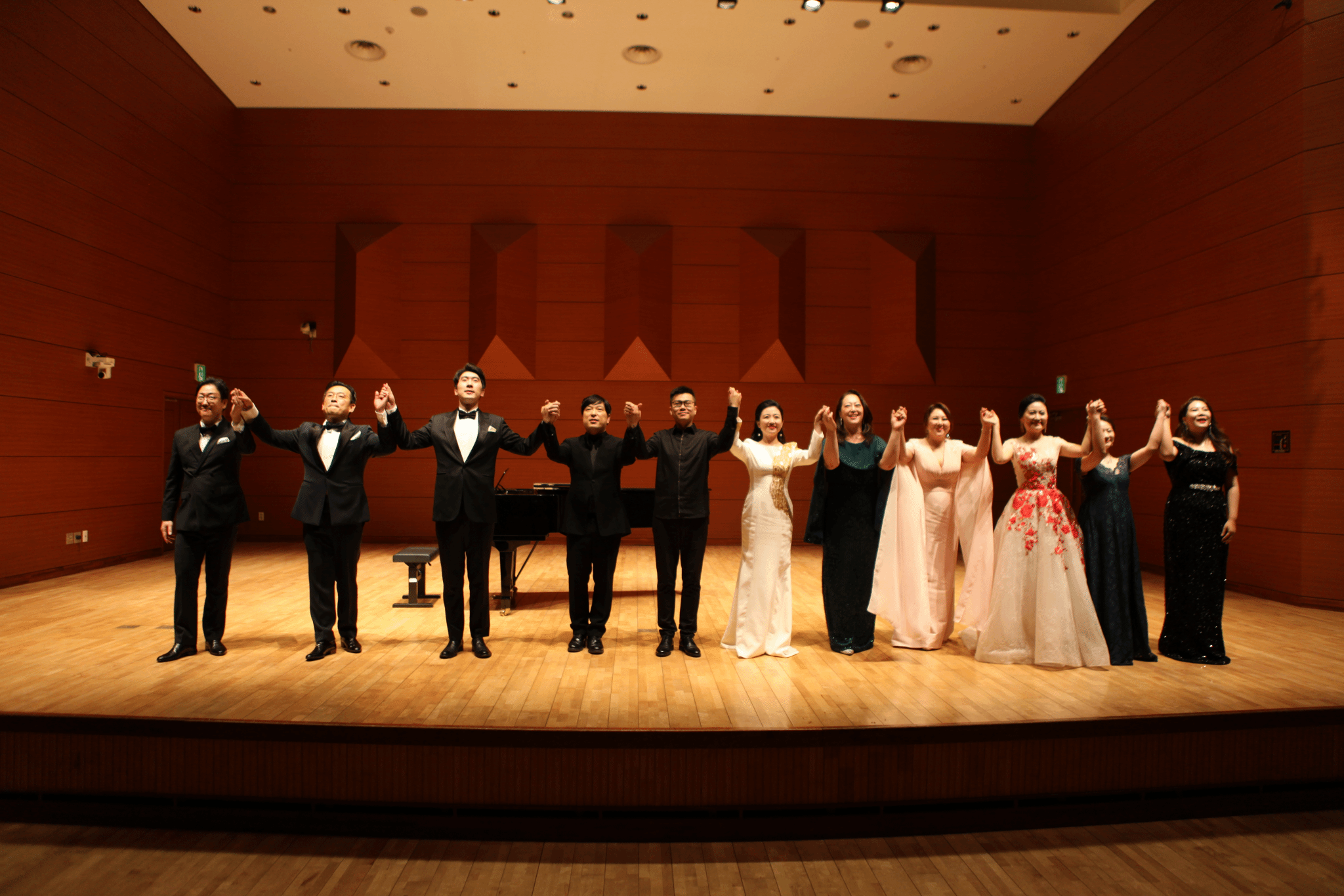 秋溪艺术大学男高音申智汉与男低音金志燮老师带来多尼采蒂歌剧《爱的甘醇》中的二重唱《Ardir! .. Voglio dire lo stupendo 》,两位老师默契配合,歌声交织碰撞,将歌剧里的情感纠葛诠释得扣人心弦,将音乐会推向又一个高潮。