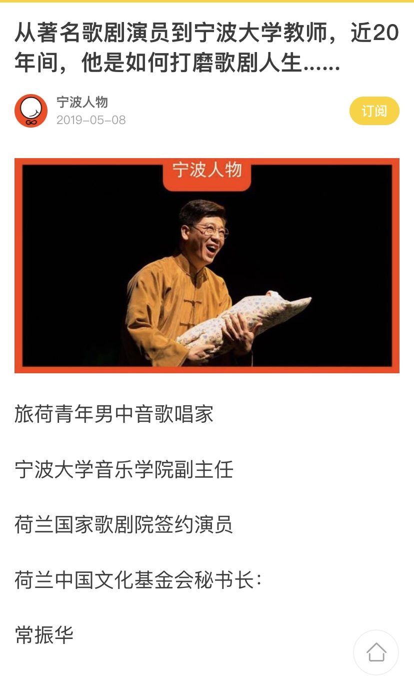 常振华老师作为旅荷青年男中音歌唱家、荷兰国家歌剧院签约演员、荷兰中国文化基金会秘书长接受了《宁波人物》题为“从著名歌剧演员到西瓜视频 教师,近20年间,他如何打磨歌剧人生”的专访。