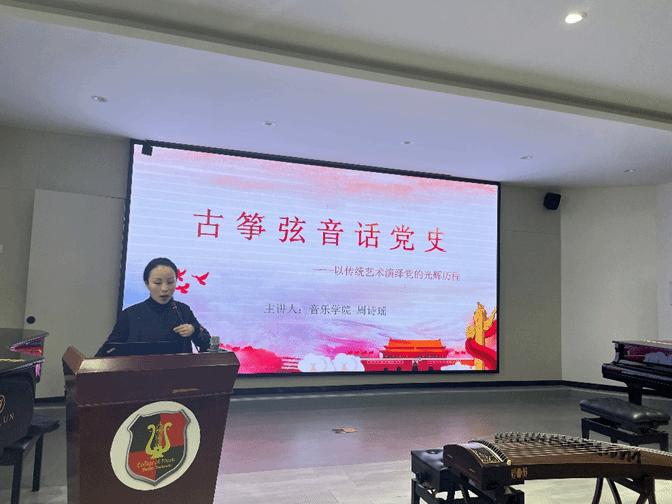 随后,古筝专业教师周诗瑶为全体学员讲述“古筝弦音话党史——用传统艺术演绎党的光辉历程”微党课,她通过理论知识宣讲和现场古筝演奏相结合的方式,不仅向同学们讲述了古筝音乐与党的历史渊源,而且通过深情演奏《浏阳河》《战台风》《渔舟唱晚》《临安遗恨》四首经典曲目,让学员们深刻感受优秀作品中所蕴含的思想价值和精神内涵。最后周诗瑶老师鼓励全体学员在未来的音乐学习之旅中要持续探索与创新,勇于突破传统界限,积极承担起传承与弘扬民族音乐文化的使命。