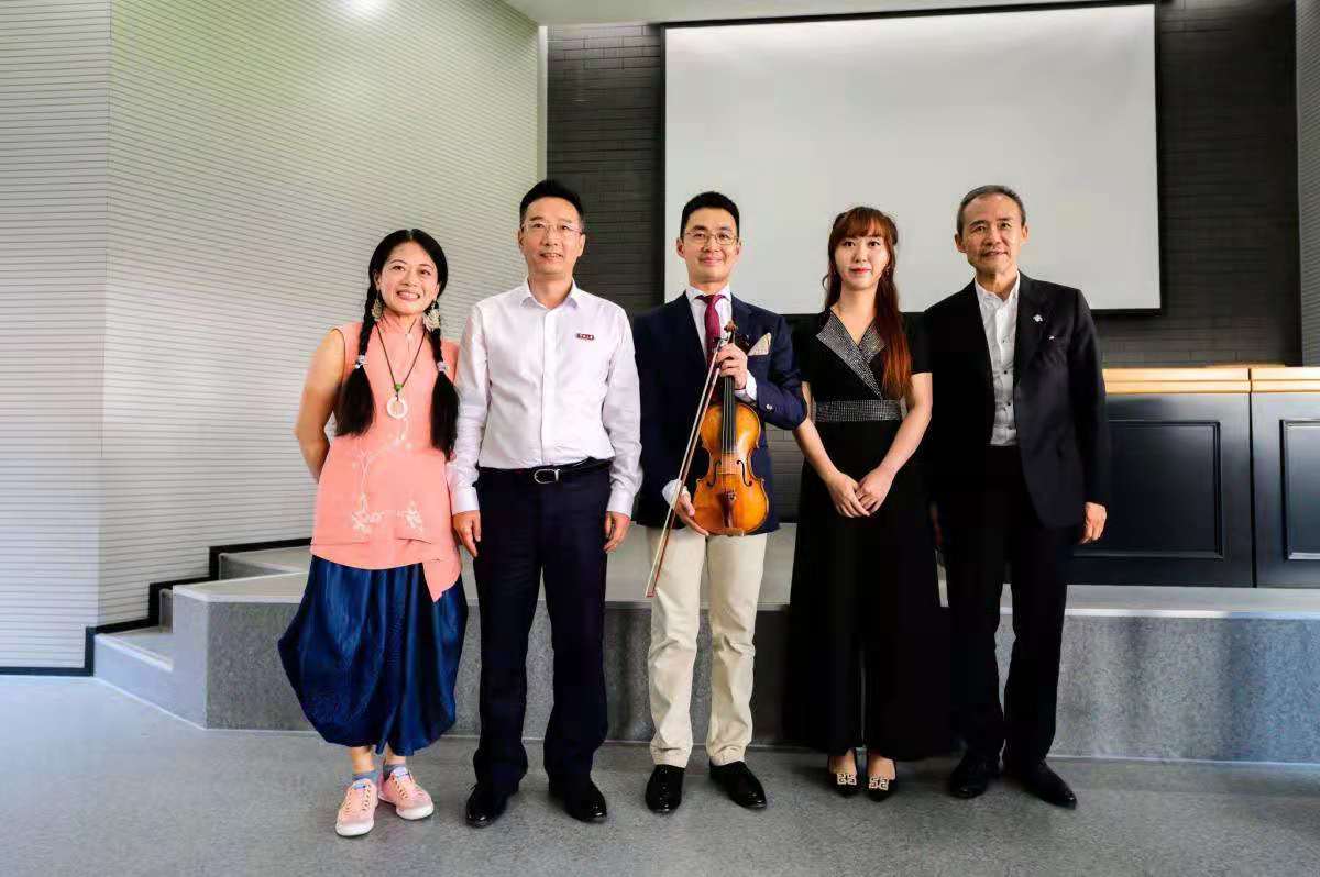 高参副教授与我院青年教师刘雪丽博士共同演绎了著名小提琴协奏曲“梁山伯与祝英台” 和意大利名曲“查尔达什舞曲”。既体验了宁波的“梁祝文化”也欣赏了西方激情洋溢的音乐。高参、刘雪丽二位演奏家的合奏堪称天作之合,婉转悠扬,艳惊四座,像是合作排练已久的老拍档。然而实际上,在本次合奏之前,二位老师并未见面排练,而是在御承堂美术馆直接用音乐沟通,不得不令人钦佩两位演奏家高超的艺术水平。在观众的热情要求下,以加演一曲久石让的“重新开始”结束了今日的活动。置身于美丽而充满活力的校园,王石主席兴致勃勃地为宁大实力打CALL!