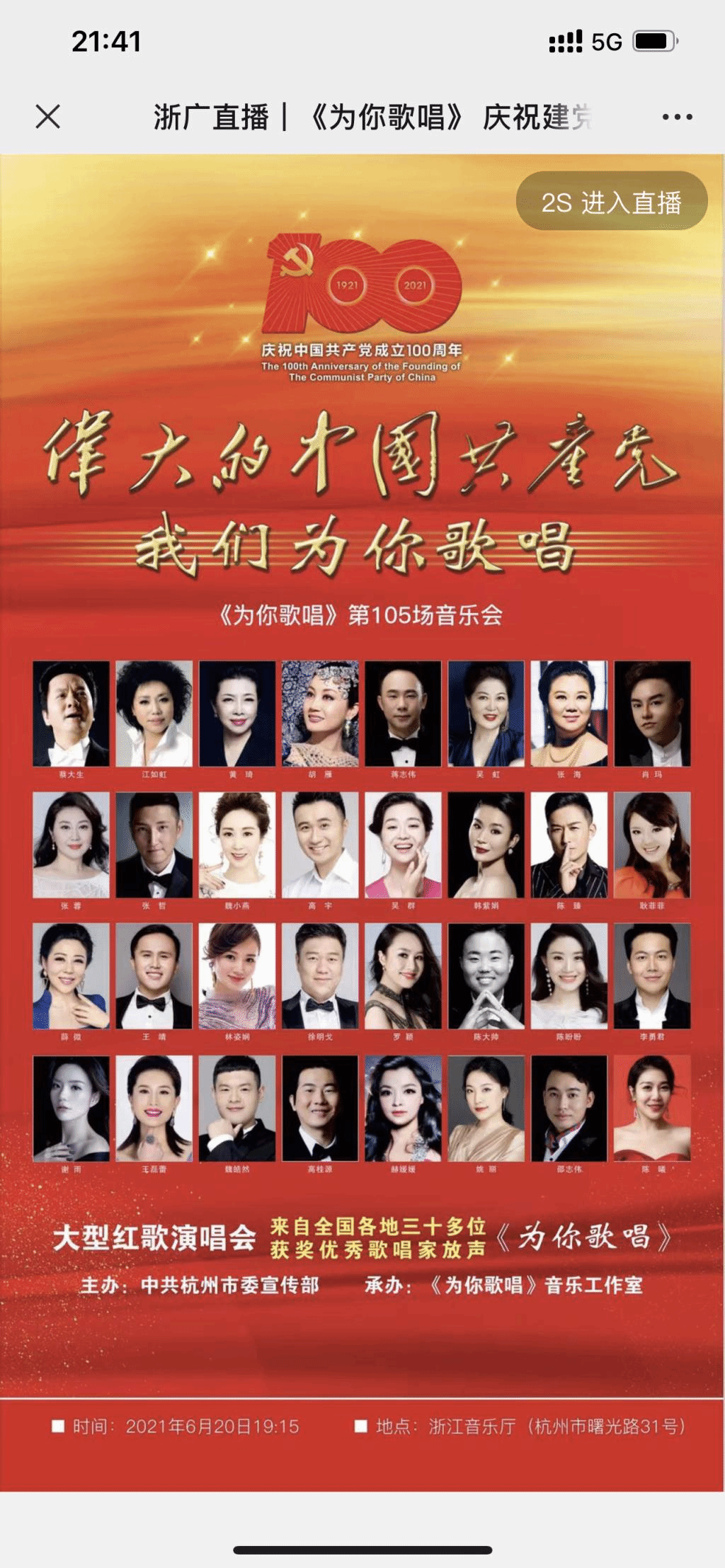 6月20日晚7:15,浙江音乐厅座无虚席,有杭州市委宣传部主办、“为你歌唱”音乐工作室承办的“为你歌唱”第105期“纪念伟大的中国共产党诞辰100周年”大型红歌演唱会准时开幕。我院高男高音歌唱家肖玛副教授应邀参加了此次活动,为观众献唱“故乡的云”,肖老师完美的演绎获得一致好评。